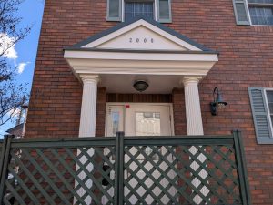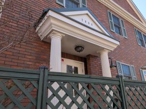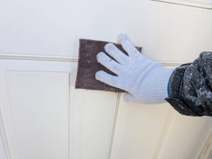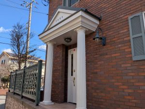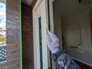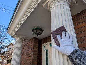 今回は玄関廻り(柱、破風板、軒天、玄関扉)の塗装工事です。