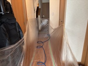 通路もしっかりと養生して、薬液散布完了となります👷